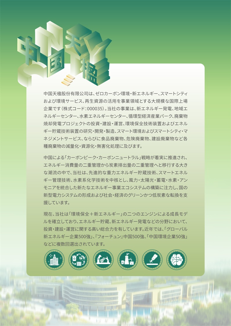 中国天楹は、高品質なストーカー式焼却発電技術、先進的なプラズマ技術、ならびに建設廃棄物、生ごみ、廃食用油などの核心処理技術を有しています。